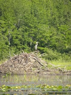 Beaver dams create habitat for many other animals and plants. Moose use the highly nutritious emergent and submergent aquatic plants found in the deeper beaver flowages. In winter, deer and moose may frequent beaver ponds to forage on shrubby plants that grow where beavers cut down trees for food, dams, or lodges. Deer benefit from lush meadows that develop along flowages when beaver dams no longer hold water. Otters, mink, raccoons, and herons hunt frogs and other prey along the marshy edges of beaver ponds. Waterfowl such as black ducks, wood ducks, hooded mergansers, and green-winged teal are closely tied to these flowages to forage, raise young, and rest during migration. Ducks and geese may even nest on top of beaver lodges, which offer warmth (from the beavers that live below) and protection (especially when lodges are located in the middle of a pond). Trees killed by rising water levels provide perch sites for avian predators, habitat for insects, and food for insect-eating birds such as woodpeckers. These trees also develop cavities that many species of animals require for nesting.