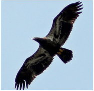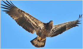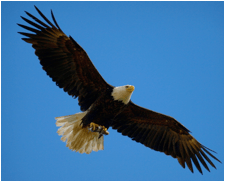 Identification: Our national symbol is highly recognizable. However, some observers do not realize their different appearance in the first 3 – 4 years. Immature eagles are generally dark with varying degrees of lighter mottling. They are full grown when fledged at 3 months of age. At 5 years of age, a (sexually mature) adult bald eagle has a pure white head and white tail that sharply contrast the dark brown feathering elsewhere on the body. In flight, notice the relatively long head / neck profile (about 50% of the length of the tail) unlike smaller proportions on a golden eagle silhouette.