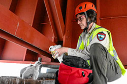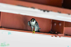 Young peregrines can be safely banded at about 3 weeks of age by teams of skilled climbers and biologists. Biologists also collect feather samples, blood samples and addled eggs to gauge exposure to contaminants. Bird bands generate information about movements and survival rates.