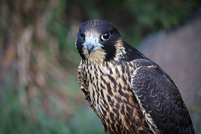 Celebrated as the fastest bird in the world, the dramatic "stoop" (a high speed dive with wings folded) enables a peregrine to reach speeds of 200 miles / hour! Long, narrow wings promote speed and agility. A small bony tubercle in the opening of each nostril helps deflect excessive air from overfilling its lungs. In a sustained stoop, the peregrine can streamline its shape even more by slightly dislocating the shoulder joints of its wings.