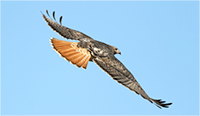 Our largest nesting buteo, the red-tailed hawk is widespread across the state. It hunts larger openings like fields and clearcuts. Seen from the back, its brownish-red tail is distinctive. High overhead, it is fairly light underneath but a dark “belly band” is easily noticed. Many migrate but some linger during the winter and can be seen perched along highway medians.