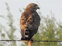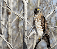 The broad-winged hawk is our smallest buteo in Maine. It is fairly plump compared to the smaller wingspan of red-shouldered hawks and especially the larger red-tailed hawk. It frequents the edges of woodlands, and is not an uncommon raptor to see perched on roadside utility lines.