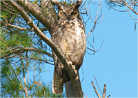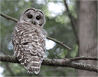 Barred owls and great horned owls are widespread year-round residents of Maine. These large owls often occupy nests of crows or other raptors. Northern saw whet owls (not pictured here) are small owls that nest in Maine’s coniferous woodlands. The breeding population of short-eared owls (not pictured here) is designated a Threatened Species due to low numbers and vulnerability as a ground nester in grassland or expansive marshes. Short-eared owls are more frequently seen in Maine during migration and winter.