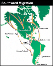 There are few locations along the southward migration path that provide adequate food resources in conjunction with nearby suitable roosting sites at the appropriate time to meet energy requirements. Therefore, shorebirds often concentrate in extremely large groups at distantly separated wetlands. Coastal staging areas in the Gulf of Maine are recognized as the most important southward staging area for shorebirds in eastern North America.