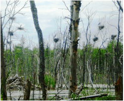 Wading bird breeding habitat includes upland and wetland areas used for courtship and mating, nesting, and rearing young. Herons and egrets nest in colonies, building stick nests in trees; whereas other wading birds nest close to the ground, building nests of reeds and grasses among wetland plants. The breeding season is when these birds are most susceptible to disturbance from humans including development, maintenance and construction activities, and recreation. It is also a time when adults are caring for young, creating a high demand for abundant, high quality foods.