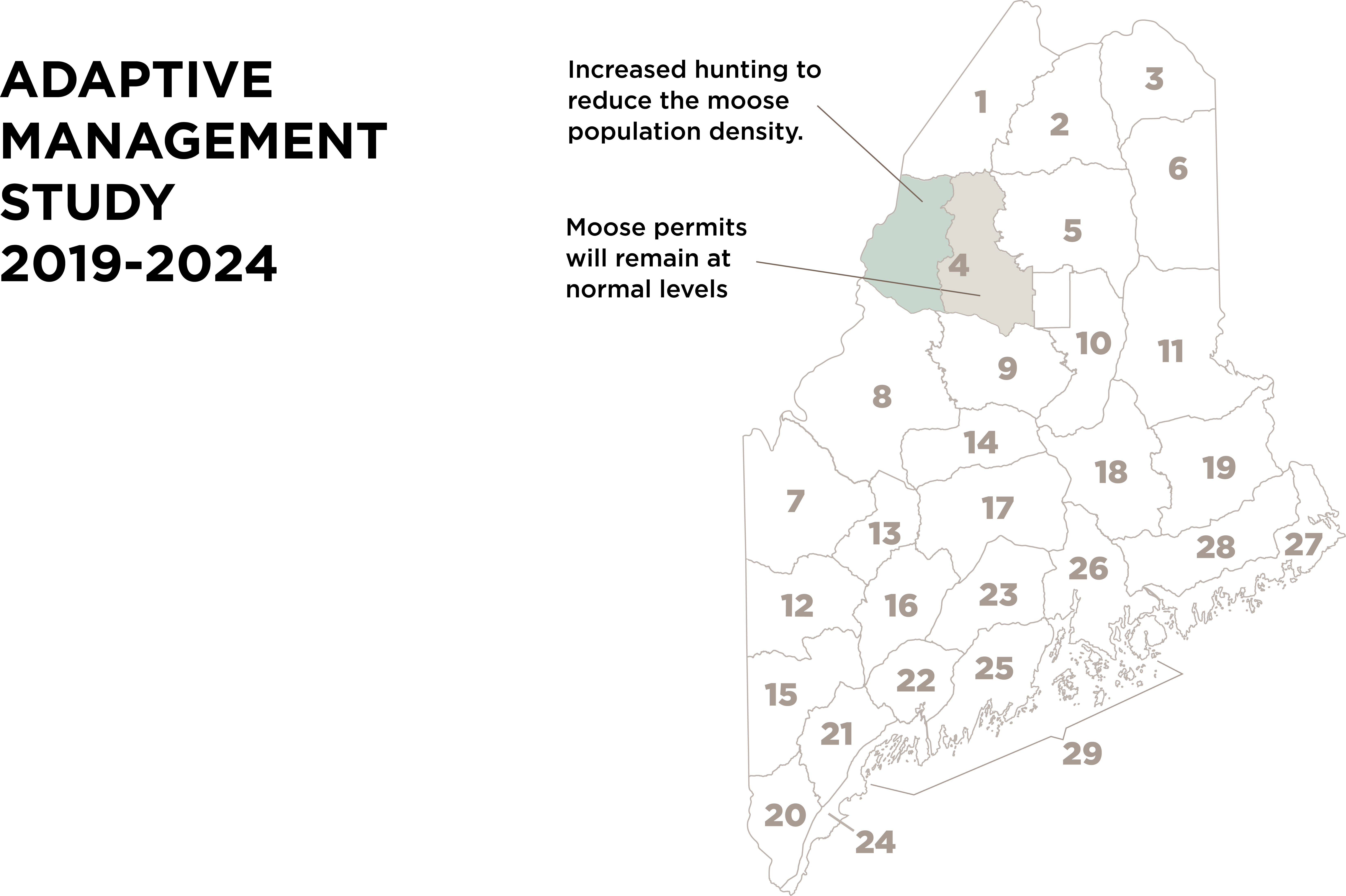 Moose research in other parts of North America shows that moose that live at low population densities have fewer ticks. To determine if moose density reduction can solve the winter tick problem in Maine, MDIFW is currently conducting a multi-phase adaptive management study. For the purpose of this study, which began in 2019 and is expected to run through at least 2025, a 2,000 square mile management zone in northwestern part of the state (Zone 4) has been divided into two similarly sized sections.