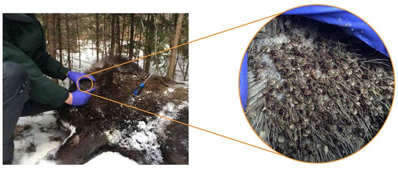In late spring, fully-fed adult female winter ticks drop off their host to seek leaf litter, where they lay up to 4,000 eggs. The eggs hatch in late summer or early fall, at which point the larvae climb vegetation, “questing” for an organism to be its host. They can sense vibrations and detect CO2 from an animal up to 20 meters away; and as a passing moose brushes by one tick, thousands of others come with it using their interlocking limbs.