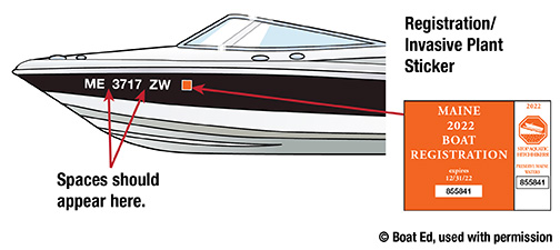 - The registration number and validation stickers must be legibly displayed on each side of the bow of the boat; painted or permanently attached in a contrasting color to provide the highest degree of visibility.