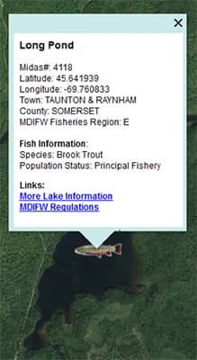 The Maine Fishing Guide Google Earth Data Layers were developed by the Fisheries Division of the Maine Department of Inland Fisheries and Wildlife to help anglers locate sportfish populations in lakes and ponds throughout the state and plan their outdoor adventures.
