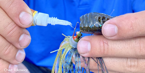 Super Glue for Jig Trailers: Although many jigs now come with metal keepers that are designed to secure your soft plastic lure trailers, one simple extra step can increase their effectiveness.