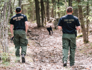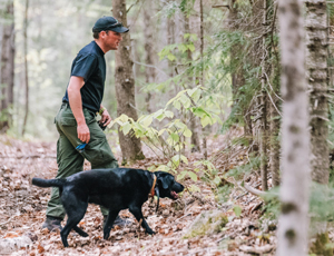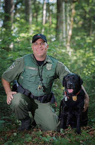 Katie rushes to keep up with Landowner Relations Corporal Dave Chabot and K9 Ruby on a practice track through the woods. After, the wardens chat about evidence detection and how items containing human scent and gunpowder residue can help solve fish and game cases.