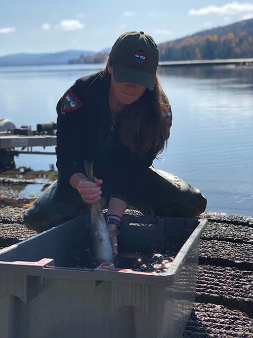 Katie learns why Sebago Lake is the perfect habitat for landlocked salmon from fisheries resource supervisor Jim Pellerin. Jim highlights the unique work he and fisheries resource technicians do in the Sebago Lake region, from fitting fish with radio tags to helping tourists plan their fishing trips.