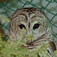 The barred owl is the only owl in Maine with brown eyes. There are usually at least two permanently injured barred owls on display at the park. Barred owls are often hit by cars as they hunt along the sides of roads for mice and other rodents. Learn more about owls from Maine Department of Inland Fisheries and Wildlife.